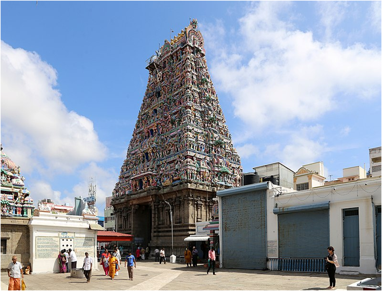 It’s not just decoration—it’s storytelling in stone. The gopuram is alive with tales: divine weddings, cosmic battles, mystics deep in meditation, demons doing... well, demon things.